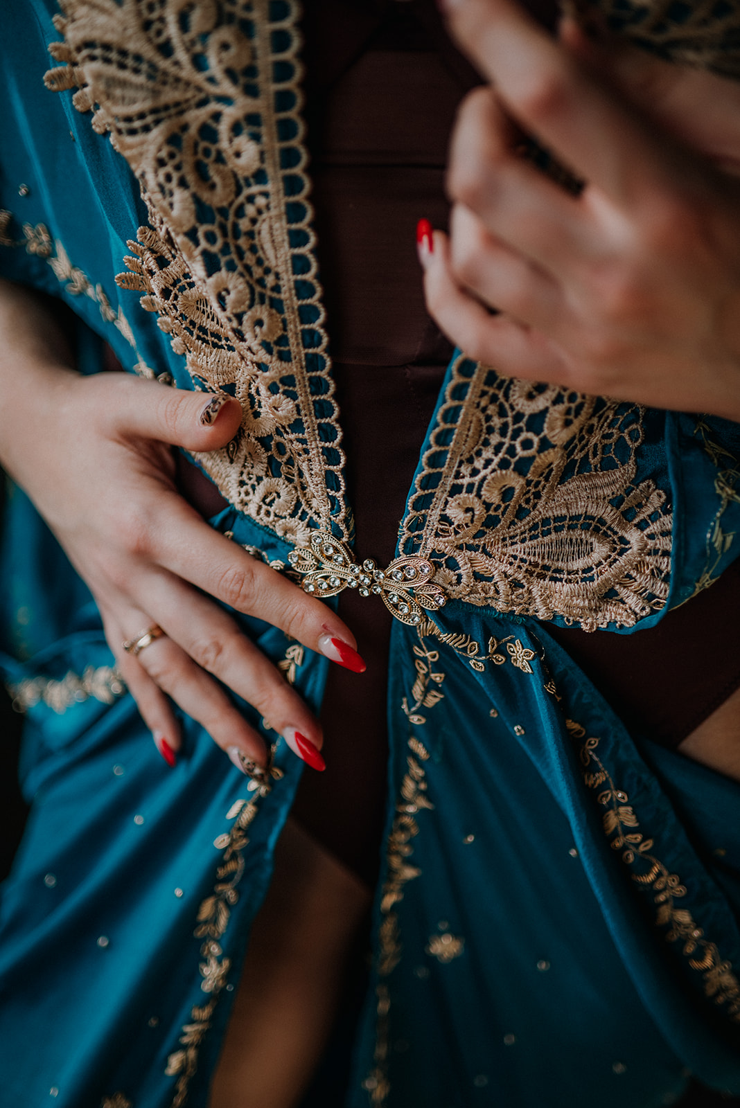 Peniuar na przedzie jest udekorowany tak spektakularnymi, a jednocześnie subtelnymi, kwiatowymi elementami. A żeby blasku stało się za dość, brzegi wzbogaciliśmy połyskliwą taśmą. Dzięki tym zdobieniom możesz być pewna, że zostaniesz zauważona. Co więcej, żadna koleżanka nie będzie miała identycznego 😉 Peniuar zdobi dekoracyjne zapięcie w formie biżuteryjnej broszki, które zawsze odrobinę odsłoni. Wszak o to nam właśnie chodzi, żeby subtelnie kusić nie odkrywając wszystkiego od razu.