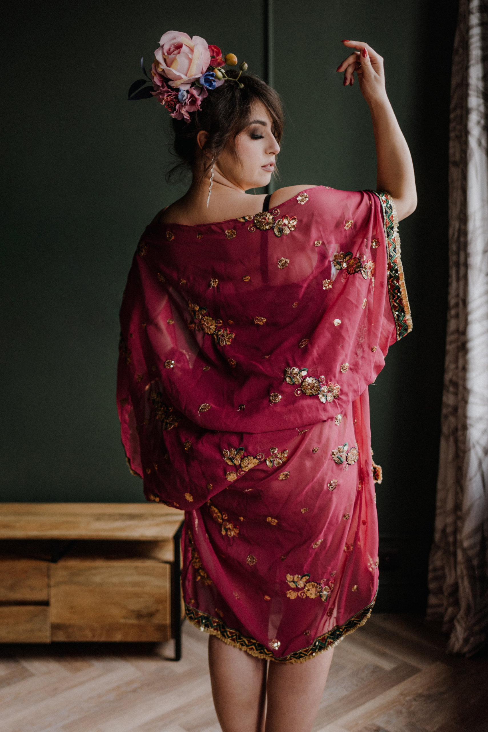 Ten peniuar, podobnie jak 90% produktów z naszej oferty został wykonany w duchu zero waste. Tkanina, z której wykonałyśmy ten peniuar pochodzi z drugiego obiegu. Została kupiona od prywatnej osoby, wyczyszczona przez nas oraz wykończona i ozdobiona tak, aby noszenie tego szlafroczka było czystą przyjemnością.