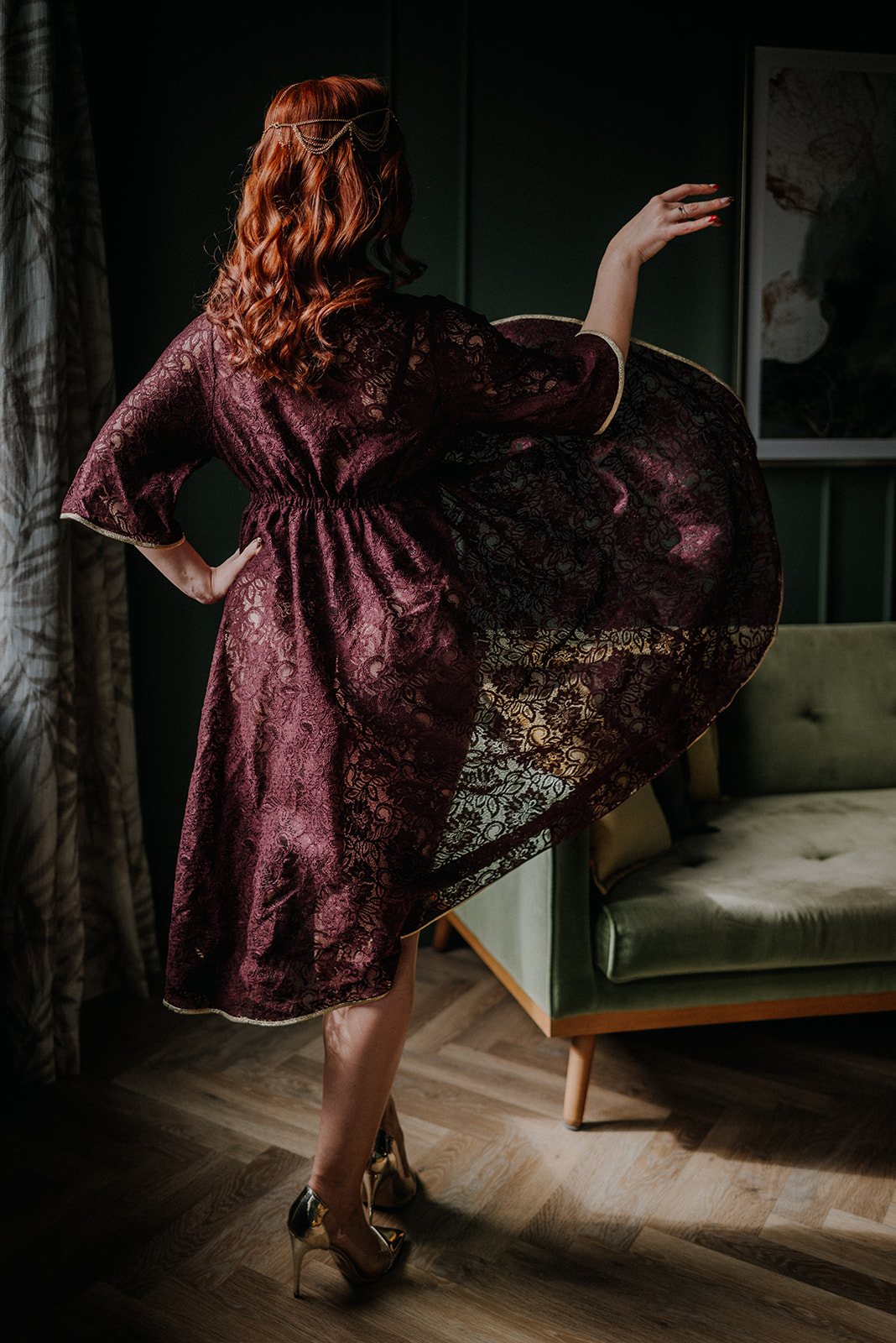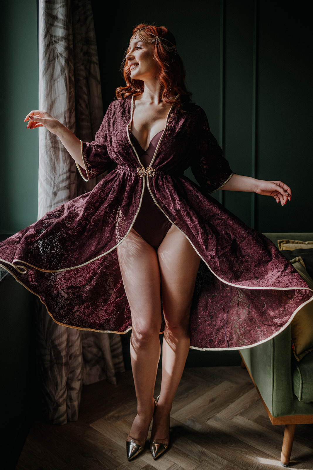 Oryginalny koronkowy peniuar z dekoracyjnym zapięciem to idealne rozwiązanie na leniwe poranki czy intymne wieczory. Wykonany jest w całości ze zjawiskowo miękkiej koronki w kolorze ciemnego fioletu. Złota taśma wykańcza brzegi dodając szyku i elegancji. Ozdobne zapięcie w formie dekoracyjnej broszki uzupełnia całość, a krój z koła lekko układa się na ciele podkreślając kobiecą sylwetkę. Dzięki klasycznemu krojowi peniuar wysmukla optycznie talię i nadaje sylwetce lekkości.
