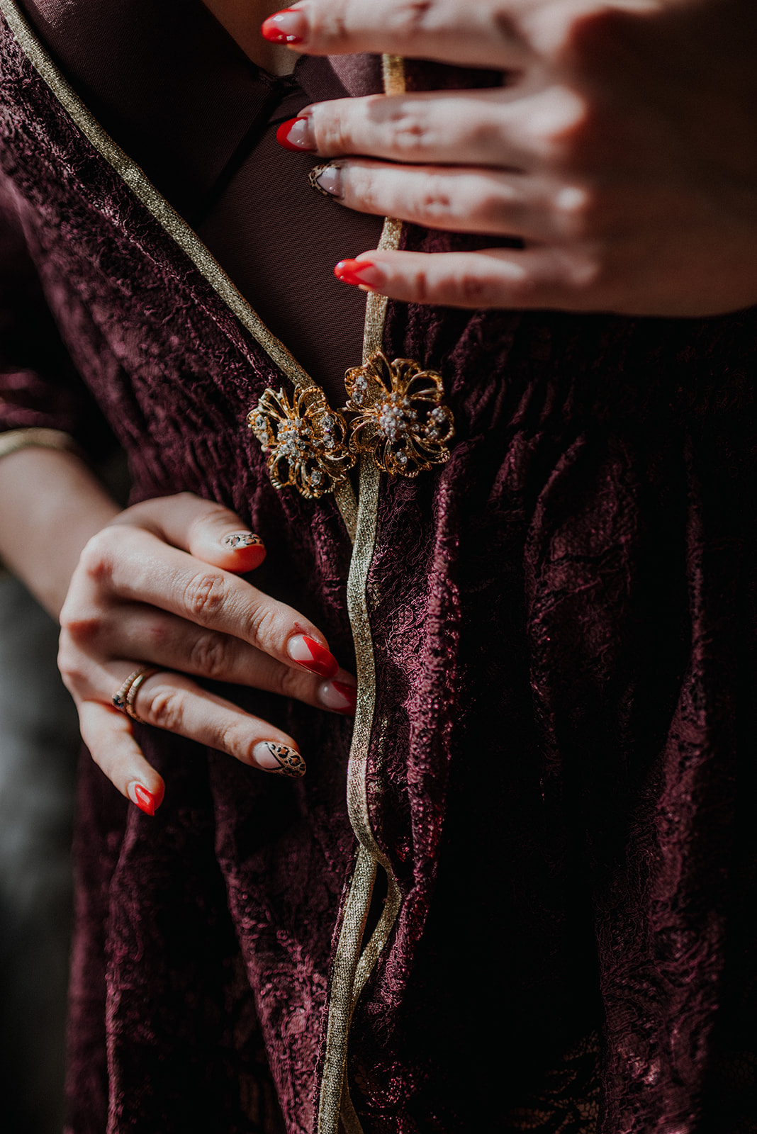 Oryginalny, ciemnofioletowy szlafrok z koronki z dekoracyjnym zapięciem to idealne rozwiązanie na leniwe poranki czy intymne wieczory. Wykonany jest w całości ze zjawiskowo miękkiej koronki w kolorze ciemnego fioletu. Brokatowa, złota taśma wykańcza brzegi dodając szyku i elegancji. Ozdobne zapięcie w formie dekoracyjnej broszki uzupełnia całość, a krój z koła lekko układa się na ciele podkreślając kobiecą sylwetkę. Dzięki klasycznemu krojowi peniuar wysmukla optycznie talię i nadaje sylwetce lekkości.
