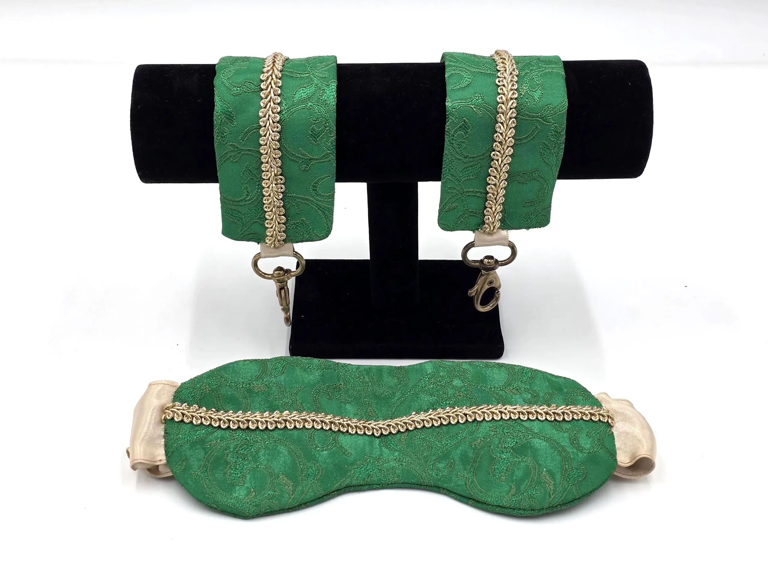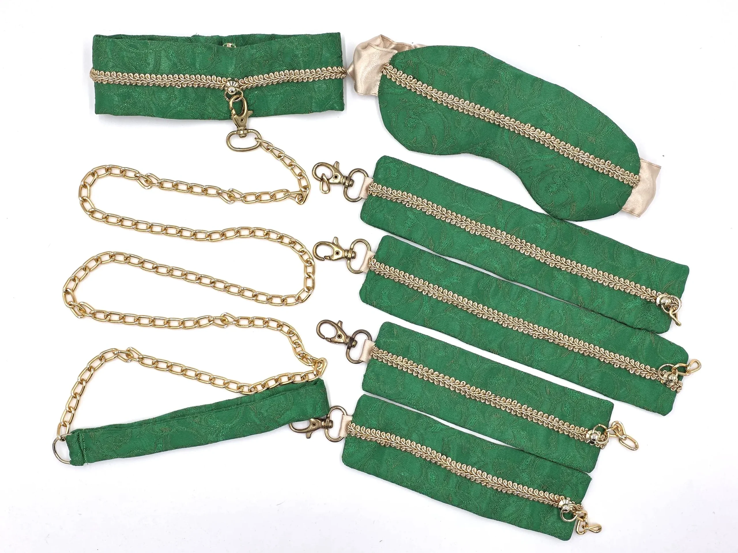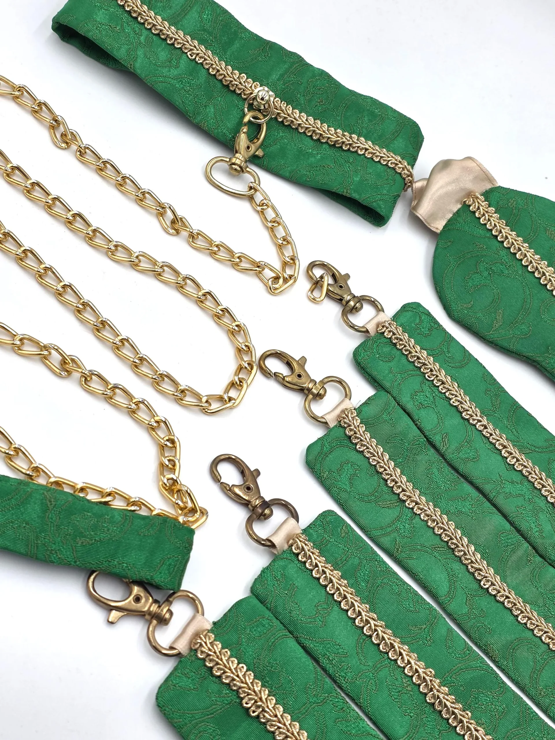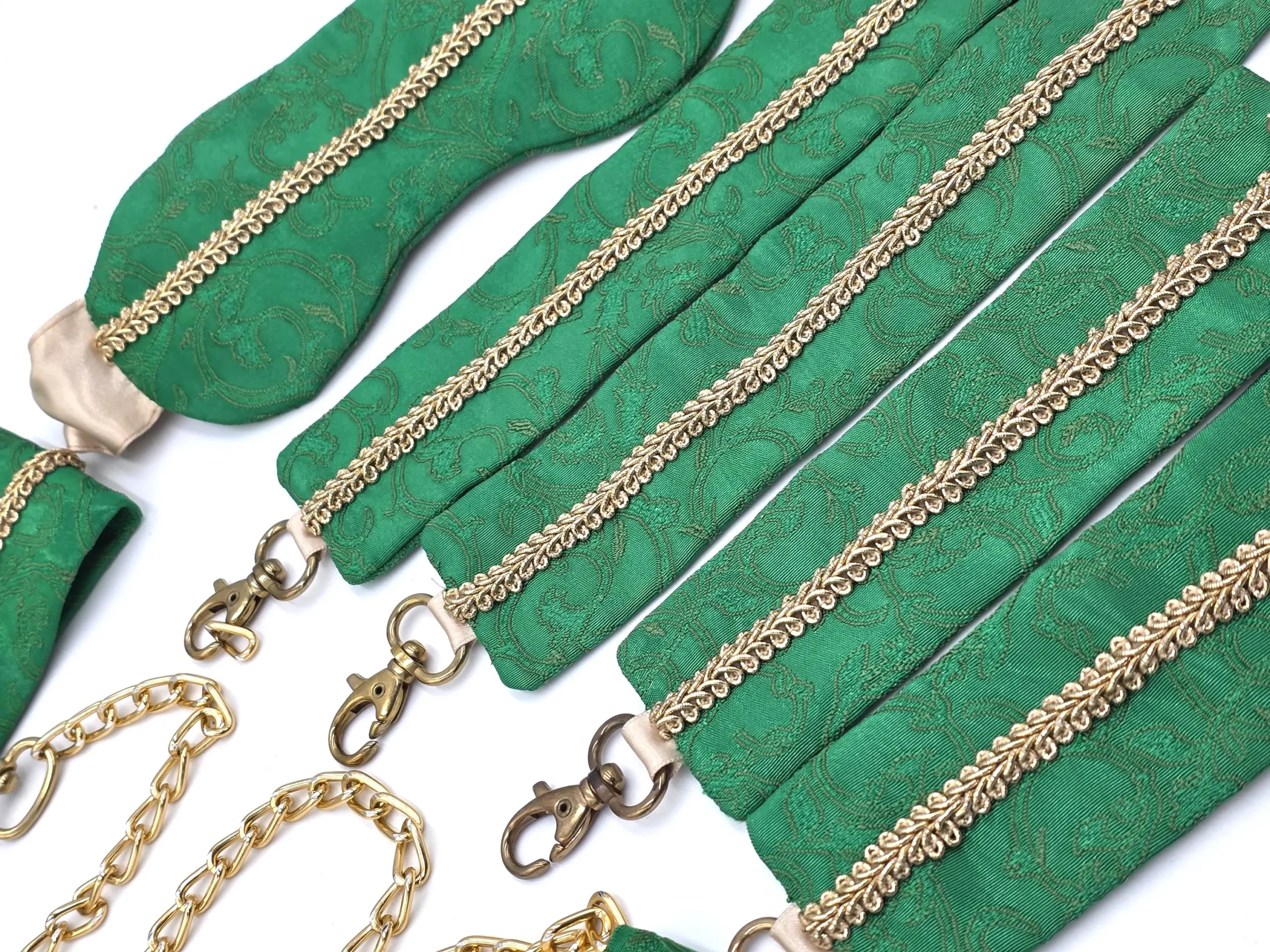 Delikatna tkanina w kolorze szmaragdowej zieleni i połyskująca, dekoracyjna taśma z wierzchu, a wszystko to spięte złotymi detalami – delikatność w praktycznej oprawie. Obroża zapinana na zatrzaski z dwustopniową regulacją obwodu, smycz zakończona karabinkiem umożliwiającym przypięcie jej do obroży, elastyczna opaska i kajdanki na ręce i nogi z możliwością regulacji, oraz łańcuszkowy łącznik, rozszerzający zakres możliwości kajdanek.